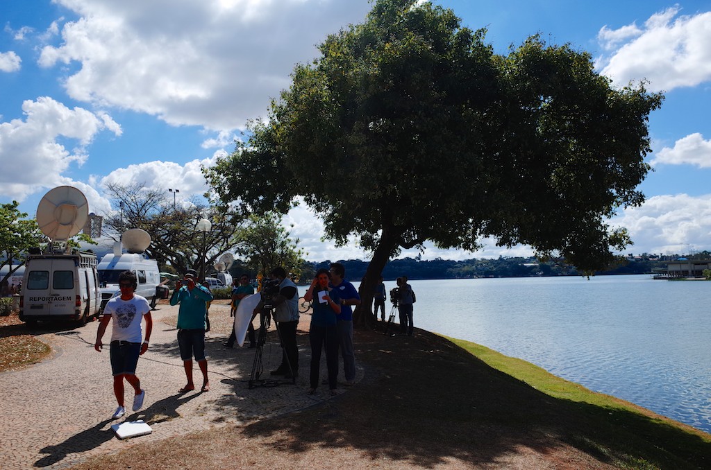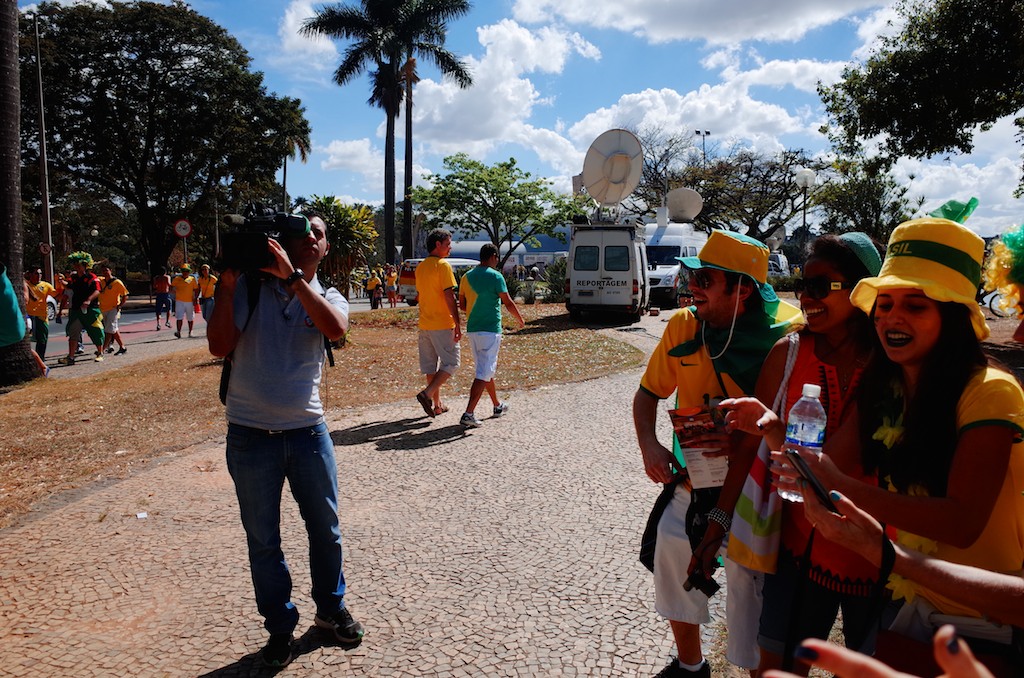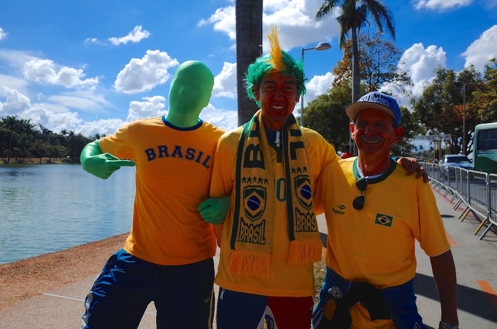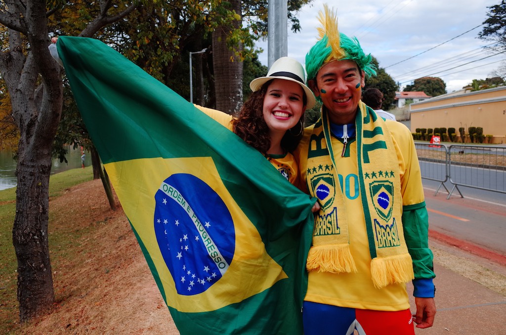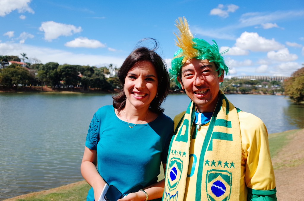 サンルイスのホストファミリーにもらったマフラー、レシフェの地元の友達から譲り受けたウィッグ、ナタールでホストファミリーがくれたフラッグ、クイアバでブラジリアンサポーターにハチマキと交換をせがまれ手に入れたユニフォーム、戦利品の集大成とも言えるフル装備の応援コスチュームはブラジリアンに大人気。バスで仲良くなったブラジレイラに引っ張られ、日本のネイマールはフェリッペ監督似のおじさんといっしょに何局かのテレビに映った。英語のアナウンサーには気の利いたコメントもできたけど、地元の番組ではポルトガル語の台本を用意された。