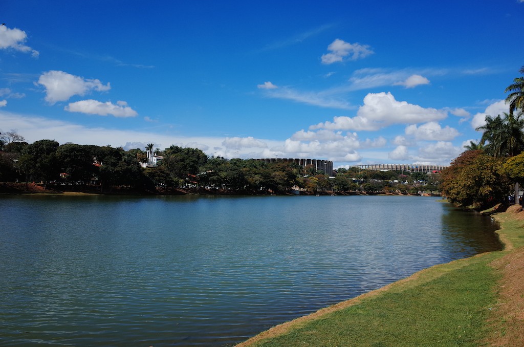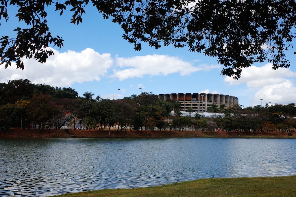 若きオスカー・ニューマイヤーによりデザインされたサンフランシスコデアシス教会を過ぎると、パンプーリャ湖畔の向こうにミネイロンが見えてくる。緑の芝生と林、青い空と湖、カナリア色のサポーターの絶妙の配色。オスカーはここまで計算していたのかどうかわからないが、こんなに美しく絵になるスタジアムまでの道のりは他に記憶がない。