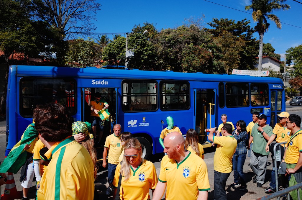 ホームステイ先のノバ・リマから市内バスでベロオリゾンテのダウンタウンまで出て、そこからスタジアム行きのシャトルバスに乗り換える。車内はカナリアサポーター応援ツアーと化す。ドイツの恐怖を打ち消すかのように大声でチャントを叫ぶ。窓から身を乗り出し沿道を歩くブラジルサポーターと呼応する。不安を紛らわすため揺れる車内ではしゃぎ踊るブラジレイロ。それを見守るブラジレイラの表情は不安というか馬鹿騒ぎできるものこれが最期かもしれないと覚悟しているかのようにも見える。