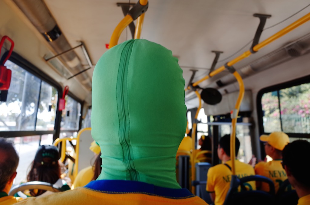 サンルイスのホストファミリーにもらったマフラー、レシフェの地元の友達から譲り受けたウィッグ、ナタールでホストファミリーがくれたフラッグ、クイアバでブラジリアンサポーターにハチマキと交換をせがまれ手に入れたユニフォーム、戦利品の集大成とも言えるフル装備の応援コスチュームはブラジリアンに大人気。バスで仲良くなったブラジレイラに引っ張られ、日本のネイマールはフェリッペ監督似のおじさんといっしょに何局かのテレビに映った。英語のアナウンサーには気の利いたコメントもできたけど、地元の番組ではポルトガル語の台本を用意された。