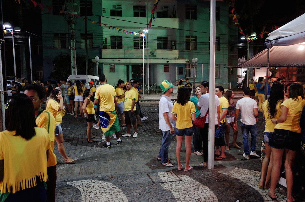 ついさっきブラジル対カメルーンの試合を終え、日本対コロンビア戦を明日に控えるクイアバのパーティー街はカーニバルのような人だかり。しかし試合前夜にも関わらず日本人サポーターの姿は少なく、深夜を過ぎた頃にはプラザを余裕のコロンビアサポーターが制圧。孤軍奮闘で日の丸のフラッグを振りチャントを歌うとブラジリアンがのってくる。写真をせがまれたりお酒をおごってもらったり今夜はいつもにも増してモテる。お祭りはまだ終わらない。奇跡を信じて。