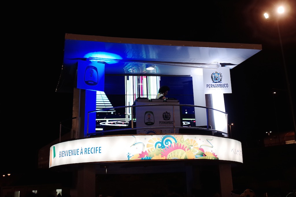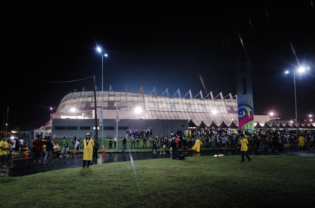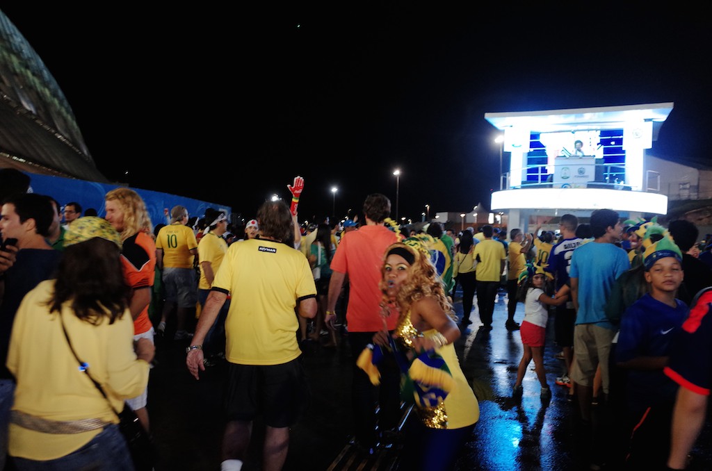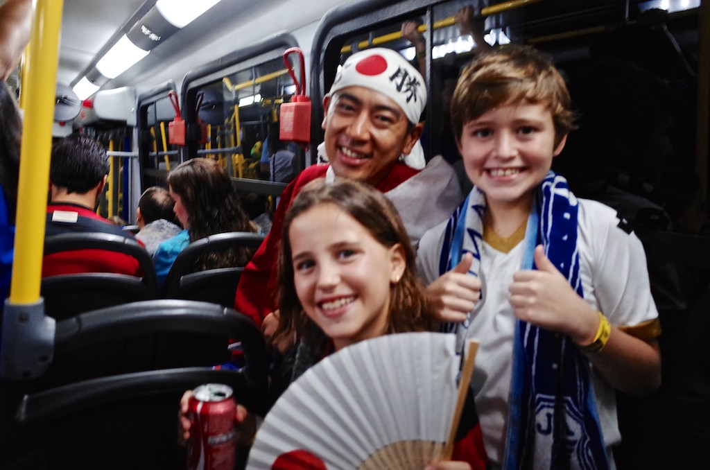 スポンサーの都合で試合キックオフは 22:00。治安の悪さだけが一人歩きするブラジルだが、一人でスタジアムに向かうサムライにサッカー王国の人々は温かい。ホストファミリーが近くのバス停まで見送ってくれるそのほんの数分にも、通りすがりの人、レストランで、車の中からから日本コールの嵐。ポルトガル語が話せなくてもこの姿を見ればスタジアムに行きたいのは一目瞭然、道を聞けばみんな親切に助けてくれる。スタジアム周辺のバスターミナルからスタジアムへ向かうバスでも日本コールの大合唱。