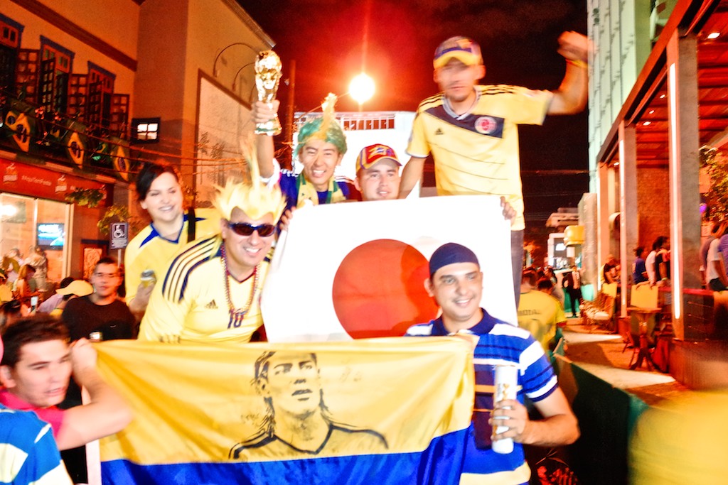 試合前のサポーター交流はワールドカップの醍醐味。手招きをするコロンビアーナに誘われカメラに向かっていっしょにダンスを踊る。赤青黄色のミサンガをもらったら日の丸ハチマキのお返しでフェアプレイを誓う。コロンビアから家族で応援に来た親子の片言の英語に片言のスペイン語で異文化コミュニケーションを試みる。ただし、行列ができるほどせがまれる記念撮影に応じれるのも今だけ。試合がはじまったら真剣勝負。