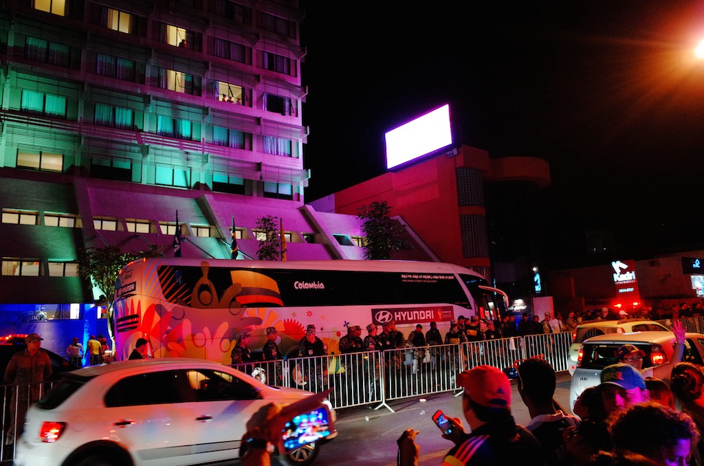 ついさっきブラジル対カメルーンの試合を終え、日本対コロンビア戦を明日に控えるクイアバのパーティー街はカーニバルのような人だかり。しかし試合前夜にも関わらず日本人サポーターの姿は少なく、深夜を過ぎた頃にはプラザを余裕のコロンビアサポーターが制圧。孤軍奮闘で日の丸のフラッグを振りチャントを歌うとブラジリアンがのってくる。写真をせがまれたりお酒をおごってもらったり今夜はいつもにも増してモテる。お祭りはまだ終わらない。奇跡を信じて。