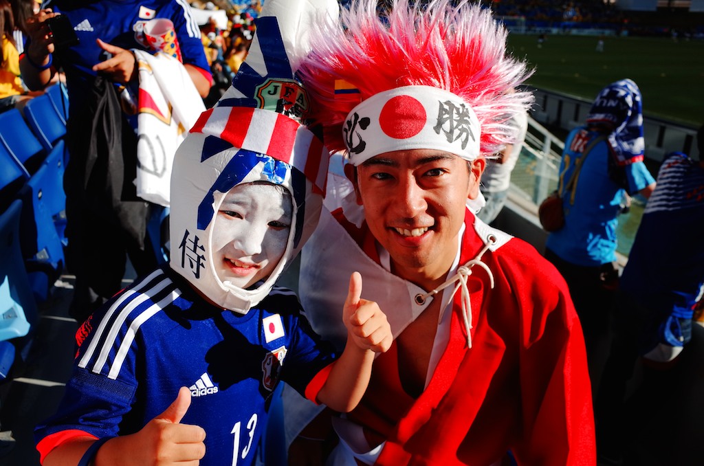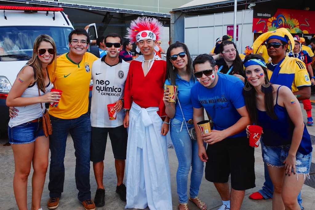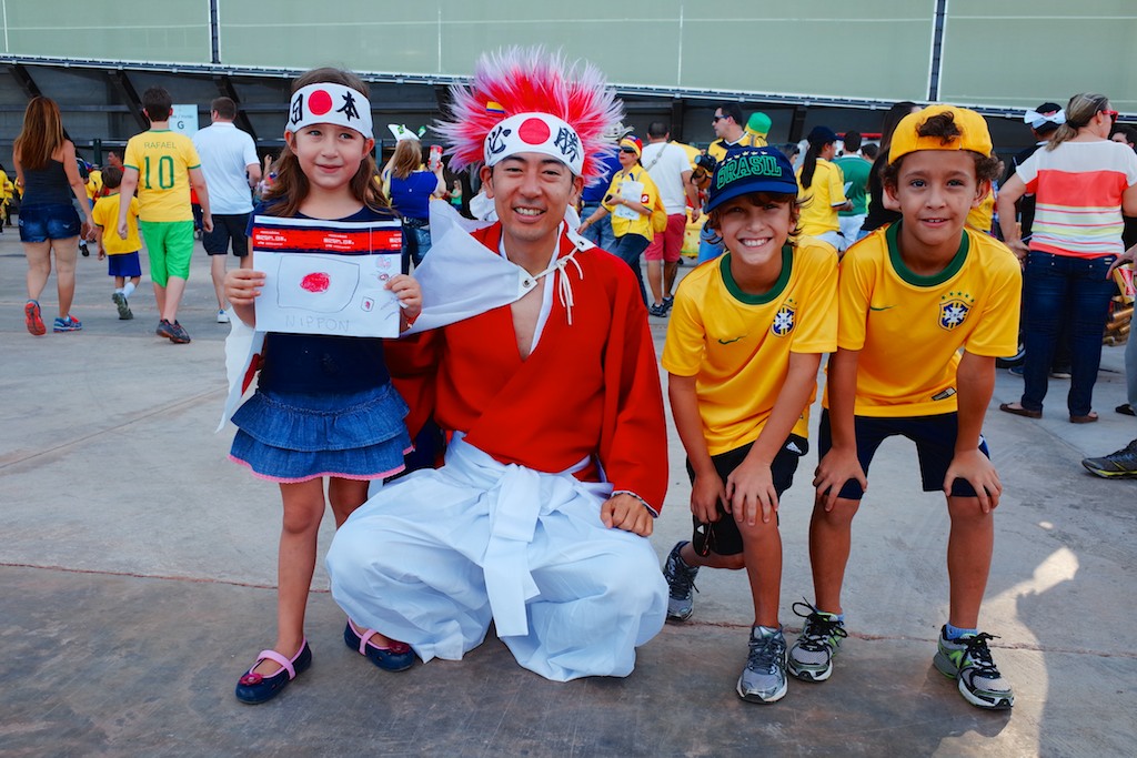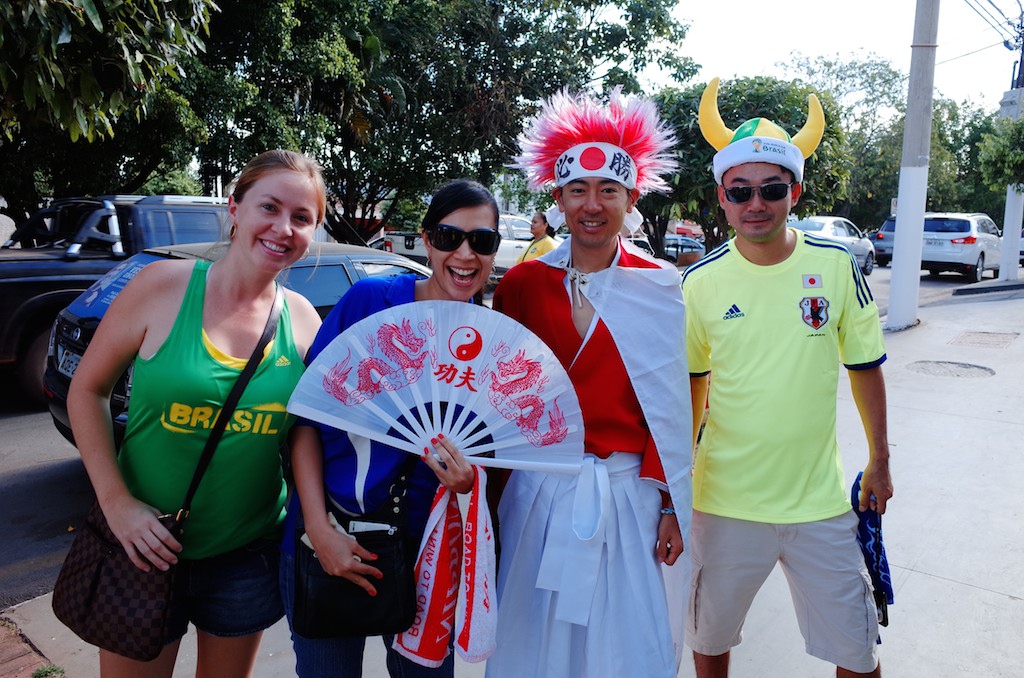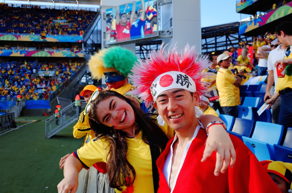 試合前のサポーター交流はワールドカップの醍醐味。手招きをするコロンビアーナに誘われカメラに向かっていっしょにダンスを踊る。赤青黄色のミサンガをもらったら日の丸ハチマキのお返しでフェアプレイを誓う。コロンビアから家族で応援に来た親子の片言の英語に片言のスペイン語で異文化コミュニケーションを試みる。ただし、行列ができるほどせがまれる記念撮影に応じれるのも今だけ。試合がはじまったら真剣勝負。