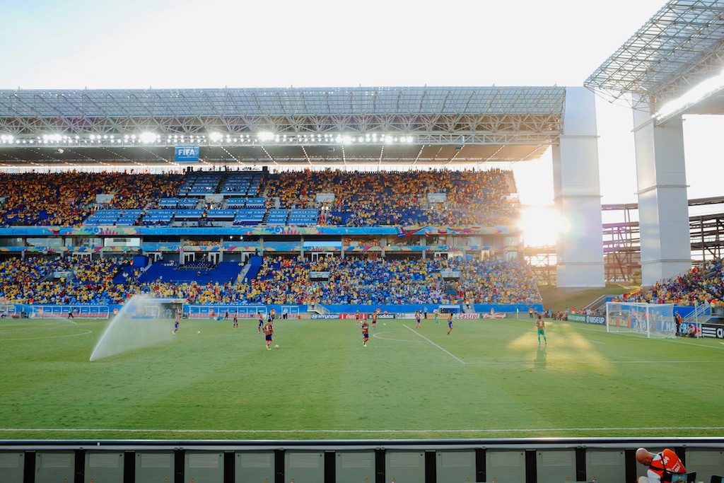 デイゲームの今日は空の青とスタジアムの白と芝生の緑が映える。コロンビアとブラジルのサポーターの黄色のユニフォームの染まったスタンド。ラテンの勢いにも圧倒されこの大会はじめてのアウェイの雰囲気を味わう。