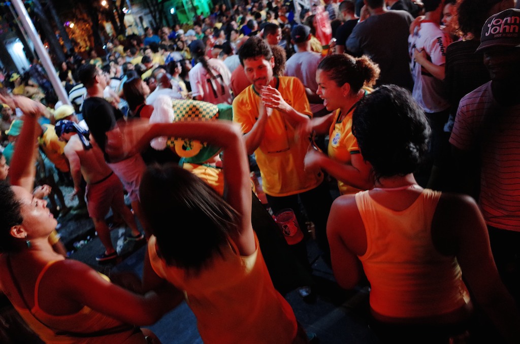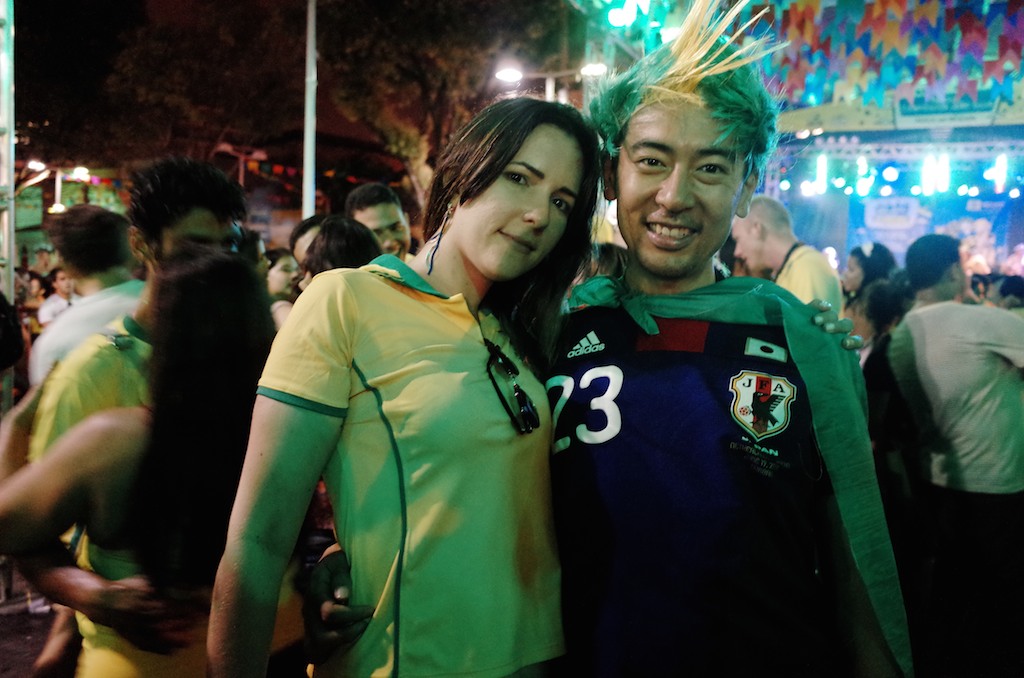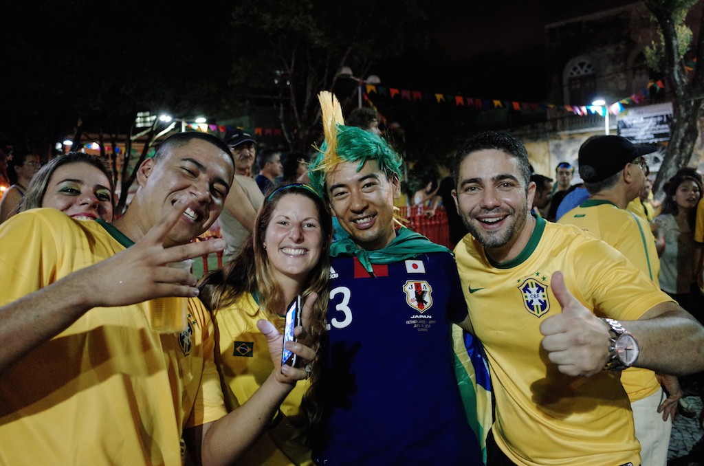 ついさっきブラジル対カメルーンの試合を終え、日本対コロンビア戦を明日に控えるクイアバのパーティー街はカーニバルのような人だかり。しかし試合前夜にも関わらず日本人サポーターの姿は少なく、深夜を過ぎた頃にはプラザを余裕のコロンビアサポーターが制圧。孤軍奮闘で日の丸のフラッグを振りチャントを歌うとブラジリアンがのってくる。写真をせがまれたりお酒をおごってもらったり今夜はいつもにも増してモテる。お祭りはまだ終わらない。奇跡を信じて。