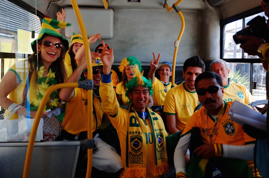サンルイスのホストファミリーにもらったマフラー、レシフェの地元の友達から譲り受けたウィッグ、ナタールでホストファミリーがくれたフラッグ、クイアバでブラジリアンサポーターにハチマキと交換をせがまれ手に入れたユニフォーム、戦利品の集大成とも言えるフル装備の応援コスチュームはブラジリアンに大人気。バスで仲良くなったブラジレイラに引っ張られ、日本のネイマールはフェリッペ監督似のおじさんといっしょに何局かのテレビに映った。英語のアナウンサーには気の利いたコメントもできたけど、地元の番組ではポルトガル語の台本を用意された。