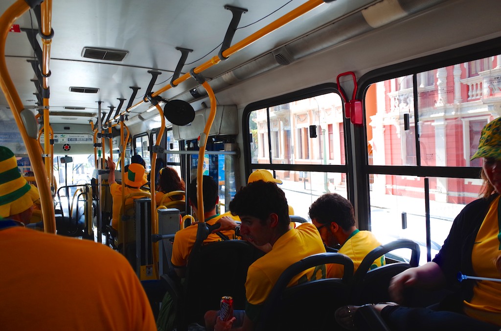 ホームステイ先のノバ・リマから市内バスでベロオリゾンテのダウンタウンまで出て、そこからスタジアム行きのシャトルバスに乗り換える。車内はカナリアサポーター応援ツアーと化す。ドイツの恐怖を打ち消すかのように大声でチャントを叫ぶ。窓から身を乗り出し沿道を歩くブラジルサポーターと呼応する。不安を紛らわすため揺れる車内ではしゃぎ踊るブラジレイロ。それを見守るブラジレイラの表情は不安というか馬鹿騒ぎできるものこれが最期かもしれないと覚悟しているかのようにも見える。