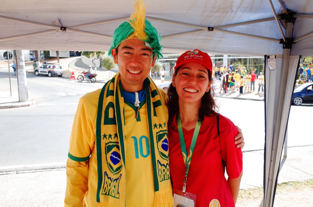サンルイスのホストファミリーにもらったマフラー、レシフェの地元の友達から譲り受けたウィッグ、ナタールでホストファミリーがくれたフラッグ、クイアバでブラジリアンサポーターにハチマキと交換をせがまれ手に入れたユニフォーム、戦利品の集大成とも言えるフル装備の応援コスチュームはブラジリアンに大人気。バスで仲良くなったブラジレイラに引っ張られ、日本のネイマールはフェリッペ監督似のおじさんといっしょに何局かのテレビに映った。英語のアナウンサーには気の利いたコメントもできたけど、地元の番組ではポルトガル語の台本を用意された。